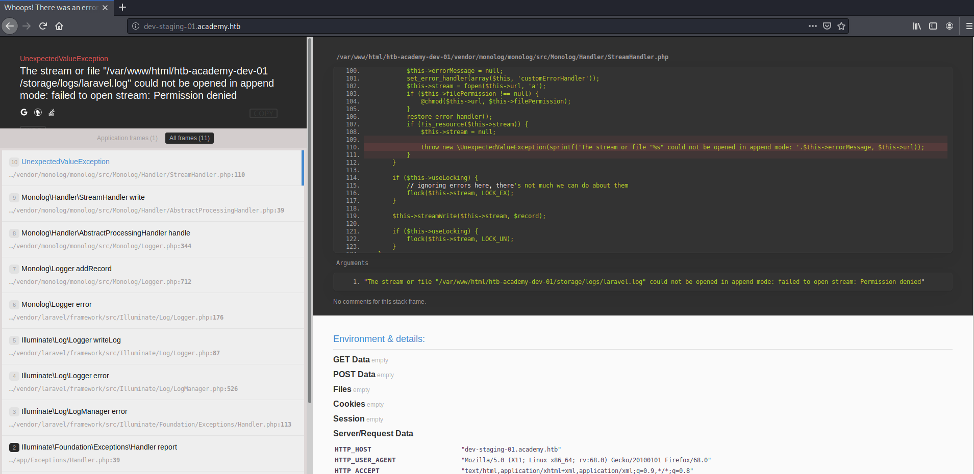 Scrolling down, there seems to be a ton of metadata thanks to someone who left Laravel's debug mode on