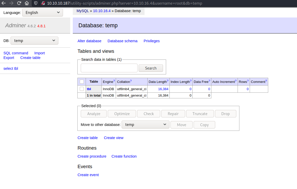 I ran some more gobuster scans and found /utility-scripts/adminer.php