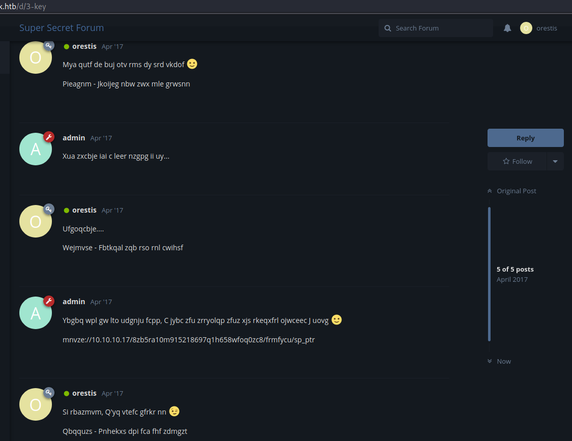 I checked out the website sup3rs3cr3t.brainfuck.htb on port 443 first. It looks like a discussion forum. Two users were visible admin and orestis