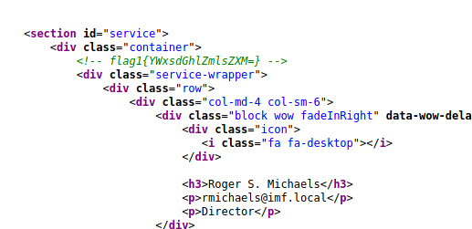 flag3{Y29udGludWVUT2Ntcw==}<br />Welcome, rmichaels<br /><a href='cms.php?pagename=home'>IMF CMS</a>
