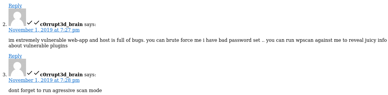wpscan found an author c0rrupt3d_brain and two plugins that stood out